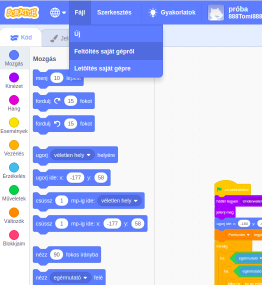 A program kódját a lap tetején látható "Kattintson ide a próba-2.sb3 fájl letöltéséhez" "gombra" kattintva tudjátok letölteni. És kipróbálni a játékot lejjebb tudjátok.